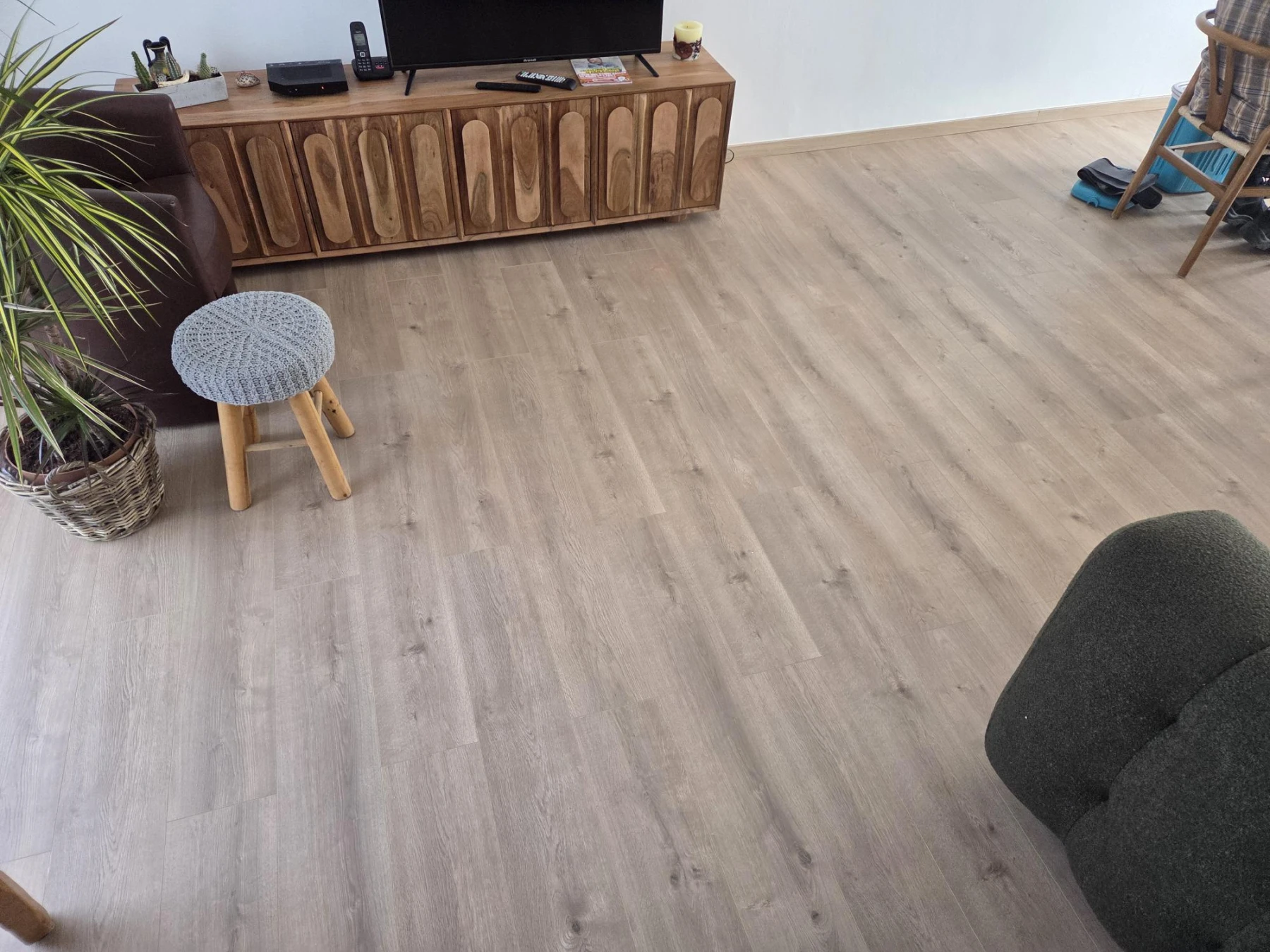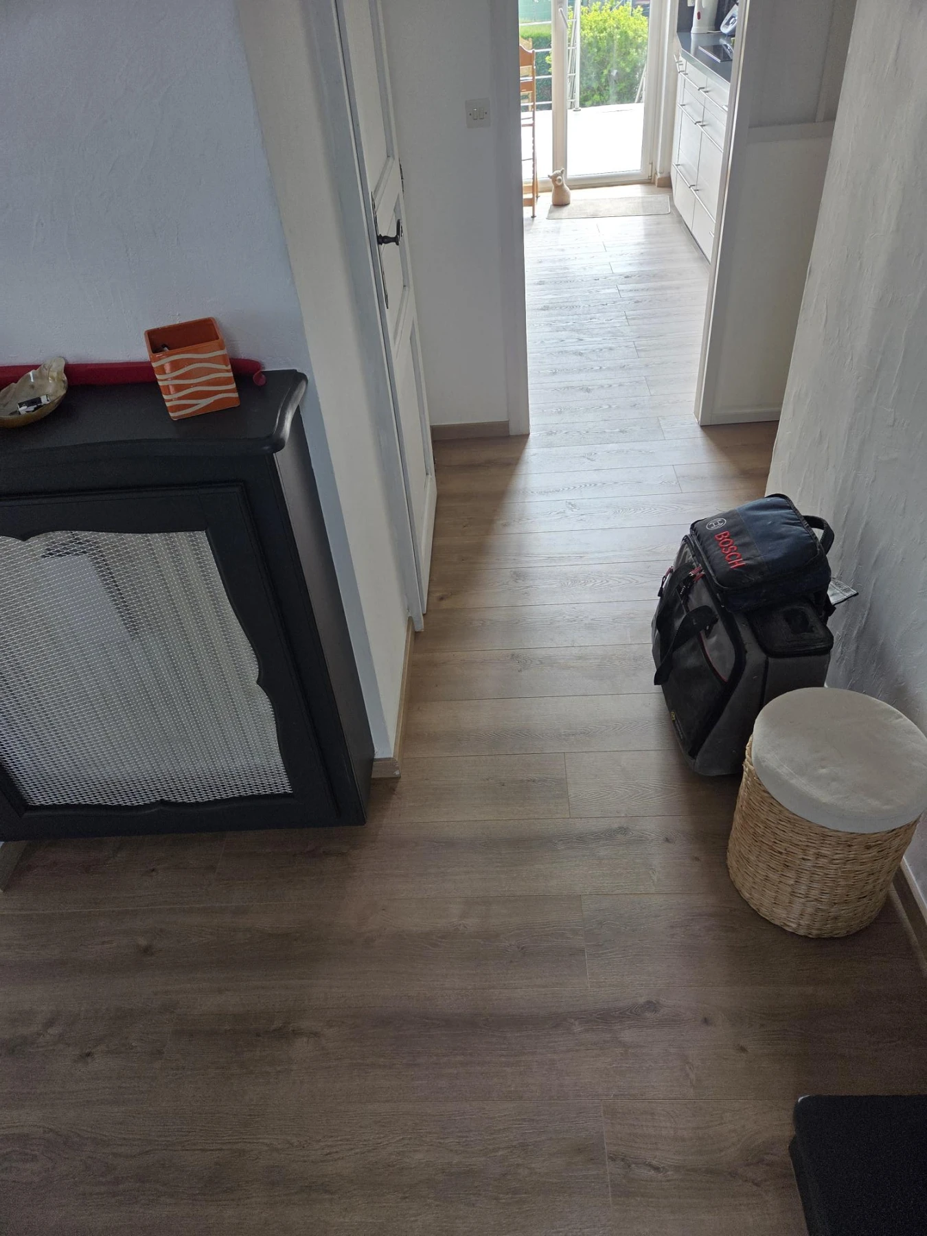Le chantier s’est poursuivi par la pose d’un parquet complet dans la cuisine, la salle principale ainsi que dans l’escalier. Le choix du parquet apporte chaleur et modernité à l’ensemble de l’habitation, tout en garantissant une grande résistance au quotidien.